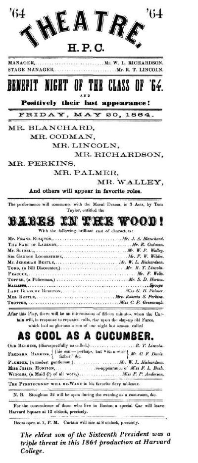 Playbill showing Robert Lincoln was involved in an 1864 theatrical production at Harvard |